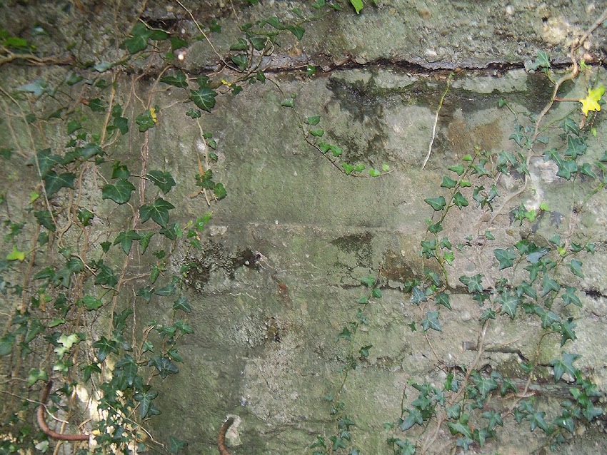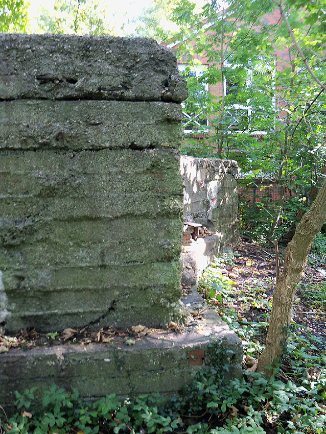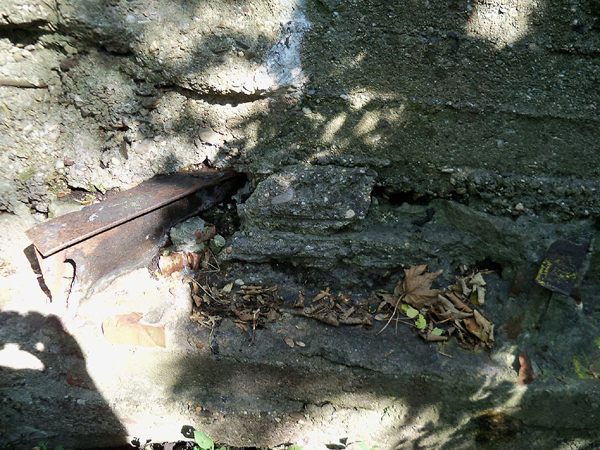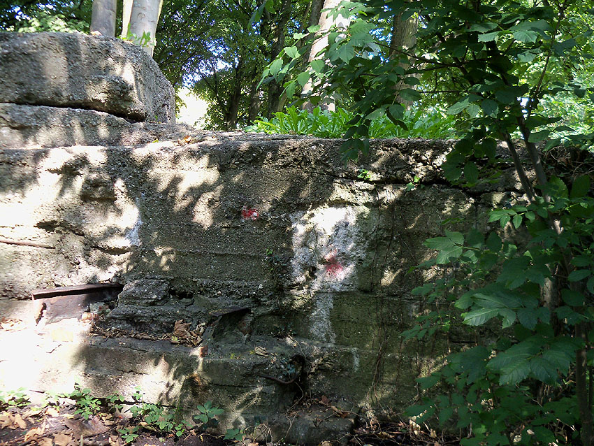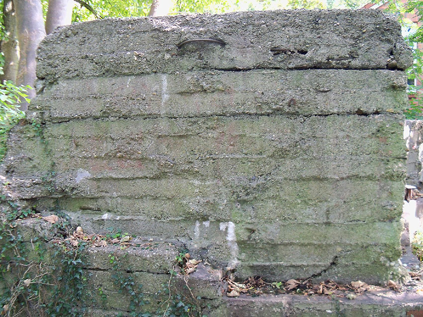 Zumindest der Eingangsbereich weist Auffälligkeiten in der Schalung auf. Hier wurde Mauerwerk mit verwendet und wohl Betonformsteine in schmaler länglicher Ausführung.