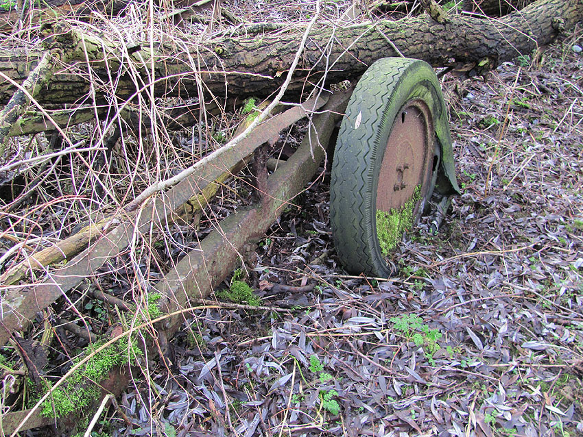 Reste eines Anhängers oder LKWs im Batteriegelände, eventuell aus Kriegszeiten: