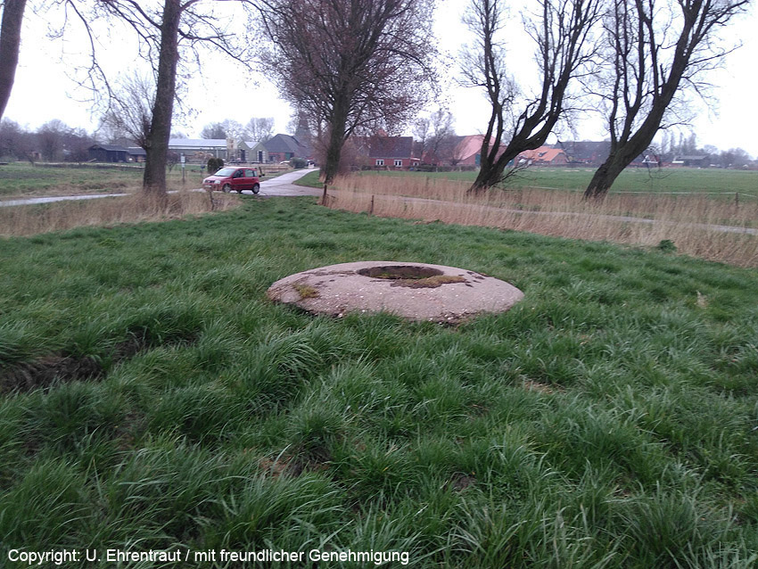 Ein weiterer Tobrukstand ("Friesentonne") wurde nachgewiesen. Er befindet sich gut erhalten an der Wegegabelung Burgweg / Meerstraße am westlichen Ortsrand von Rysum. Von hier bog die Linie zur Rundum-Verteidung der "Festung Emden" vom Deichbereich ins Hinterland ab. Emden selbst wurde wie beispielsweise Wilhelmshaven zum Kriegsende zur "Festung" erklärt und sollte für eine Rundumverteidigung hergerichtet werden. Die Stände im Abstand von 500 bis 1000 Metern im alten Seedeich ab Emder Hafen nach Westen hin wurden über Knock bis Rysum errichtet, dann bog die Linie mit dem Stand Rysum ab / an einer strategisch wichtigen Ecke wurde der Stand hier an eben der Wegegabelung realisiert. Die Linie zog sich weiter über Conrebbersweg, Osterhusen, Marienwehr und dann zurück Richtung Ems nach Petkum, wiederum an der Ems nach Westen zum Emder Hafen. Es dürften noch einige Stände unter der Erde vorhanden sein, wenn überall die Abstände eingehalten worden sind. Zum Land hin nach Norden und Osten dürften aber weniger gebaut worden sein, als am Deich. Man fürchtete zunächst eine Invasion von Seeseite - das was dann in der Normandie stattfand. Aber man dachte auch daran, dass zusätzlich zur Invasion noch eine zweite Landung im Herbst 1944 an der Deutschen Bucht erfolgen könnte. Dies war der Hauptgrund zur teilweisen Realisierung des Projektes "Friesenwall" zur Verteidigung der Deutschen Bucht. Vielen Dank an U. Ehrentraut für die Informationen zum Stand und für die freundliche Bereitstellung des Bildmaterials (Bild oben / folgende vier Bilder)!